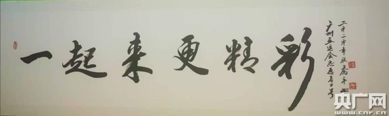喬平老師書(shū)寫(xiě)的:一起來(lái)更精彩(央廣網(wǎng)記者 傅曉勤 攝)