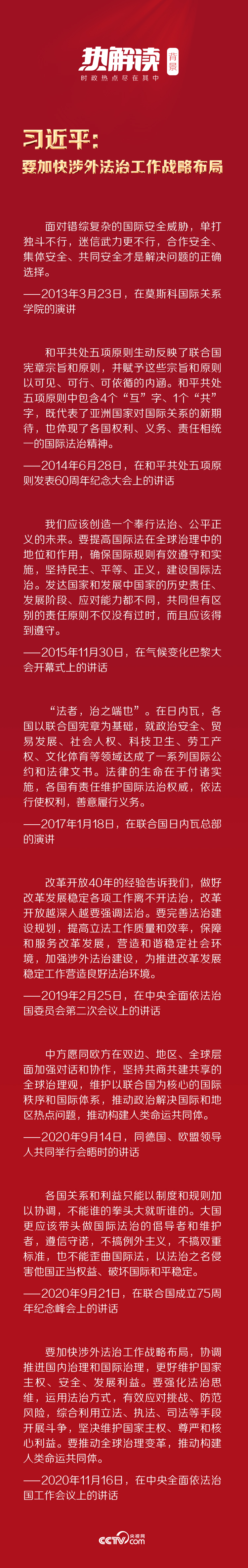 《熱解讀》注意到,早在2019年2月25日,習(xí)近平總書記主持召開中央全面依法治國委員會第二次會議時,就已明確要求加強涉外法治建設(shè),為推進改革發(fā)展穩(wěn)定工作營造良好法治環(huán)境。