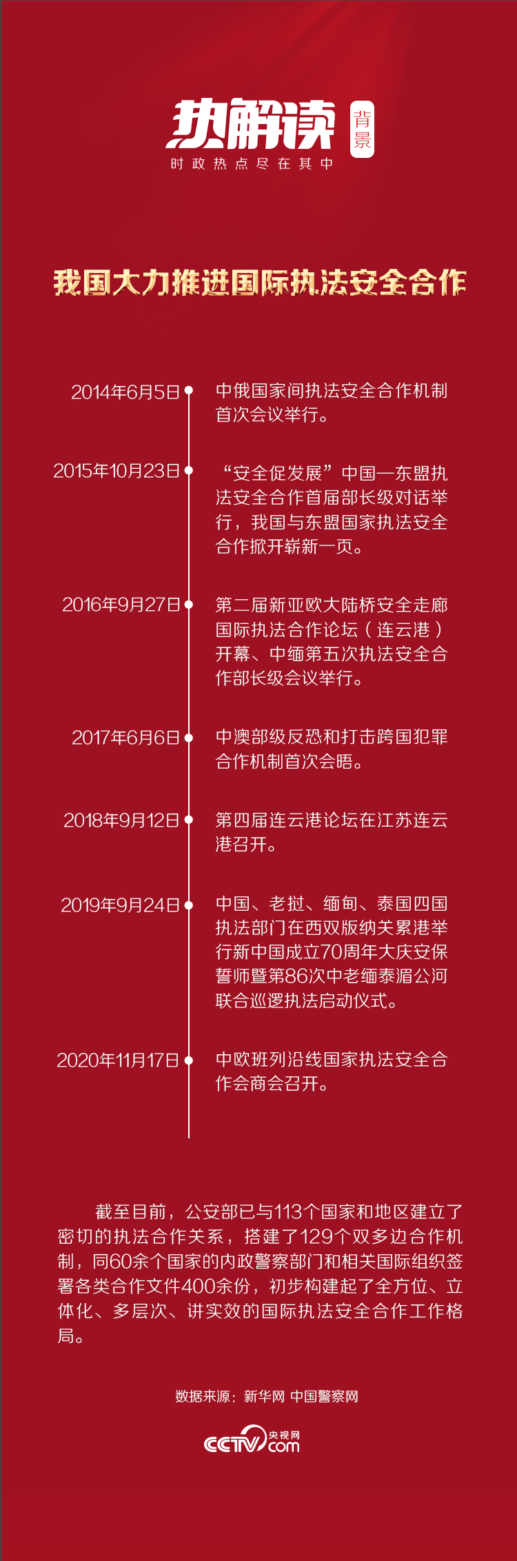 黨的十八大特別是黨的十九大以來,我國公安機關(guān)不斷拓展國際執(zhí)法合作的廣度和深度。中俄國家間執(zhí)法安全合作機制、中越打擊犯罪合作部長級會晤、中緬執(zhí)法安全合作部長級會晤、中馬公安內(nèi)政部門聯(lián)合工作組會議、中印公安內(nèi)政高級別安全與反恐會晤、中德公安內(nèi)政部門副部級年度會晤……國際執(zhí)法安全合作結(jié)出累累碩果。