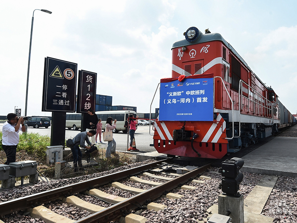 △今年10月10日,“義新歐”中歐班列(義烏—越南)從義烏西站首發(fā)啟程,最終將抵達(dá)越南河內(nèi)站。這是該班列首次開通面向東南亞國(guó)家和地區(qū)的南向通道。