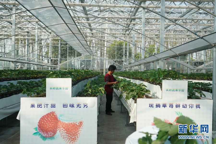 10月29日,在江蘇江都現(xiàn)代農(nóng)業(yè)產(chǎn)業(yè)園電氣化大棚,農(nóng)民在對草莓進(jìn)行日常管護(hù)。新華社記者 季春鵬 攝