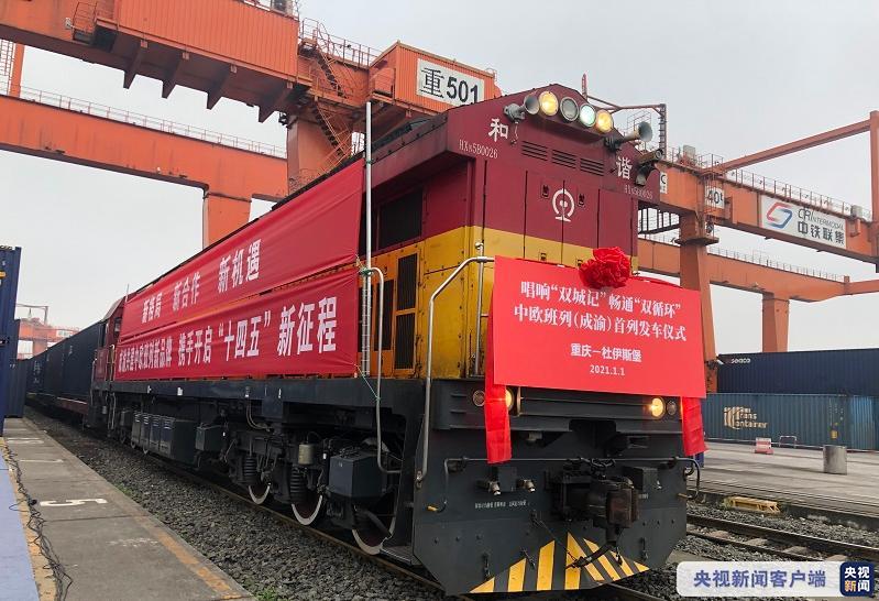 2021年1月1日上午10時,重慶、成都兩地同時發(fā)出2021年中歐班列(成渝)號第一趟列車。滿載電子產(chǎn)品、機械零件、智能家電的兩列中歐班列帶著新年的新氣象,一路向西駛往歐洲的德國杜伊斯堡和波蘭羅茲,分別到達西歐、東歐的交通樞紐中心。