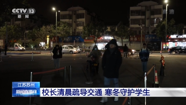 這位正在引導學生過路口的就是校長高平。受近日寒潮影響,清晨5點20分的蘇州,溫度在零下5攝氏度,高平校長準時出現(xiàn)在望亭中學校門口,查看路面是否有積雪結冰,和同事們鋪設隔離錐桶,迎接最早一撥到校自習的高三學生。