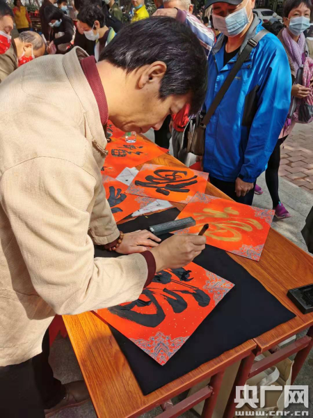揮毫寫春暉送街坊(央廣記者 傅曉勤 攝)