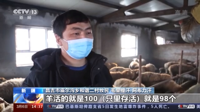 昌吉市廟爾溝鄉(xiāng)和諧二村牧民 毛里提汗·阿布力汗:外面天冷的時候,我們把羊娃抱過來(在圈里過夜)。我們這個羊活的就是100(只里存活)就是98個。