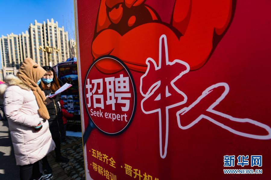 山東省青州市舉辦第20屆企業(yè)人才就業(yè)招聘會,求職者在招聘會上了解崗位信息(2月27日攝)。新華社發(fā)(王繼林 攝)