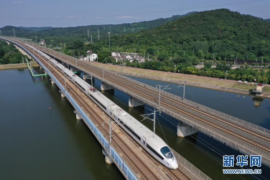 一列和諧號動車組列車駛經(jīng)京滬高速鐵路南京段(無人機照片,2020年6月30日攝)。新華社發(fā)(方東旭 攝)
