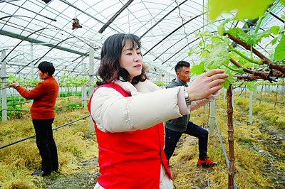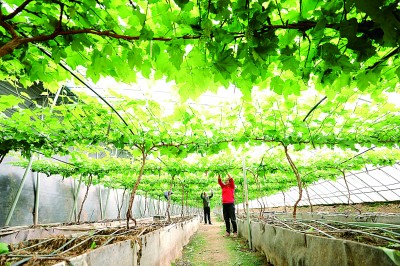 農戶在河北省巨鹿縣西郭城鎮(zhèn)南鹽池村果蔬大棚管護葡萄。胡良川攝/光明圖片