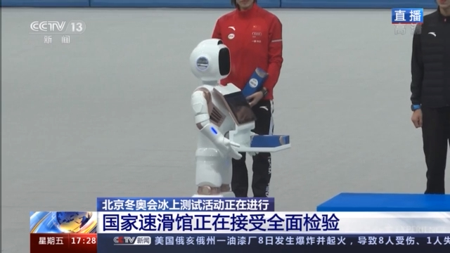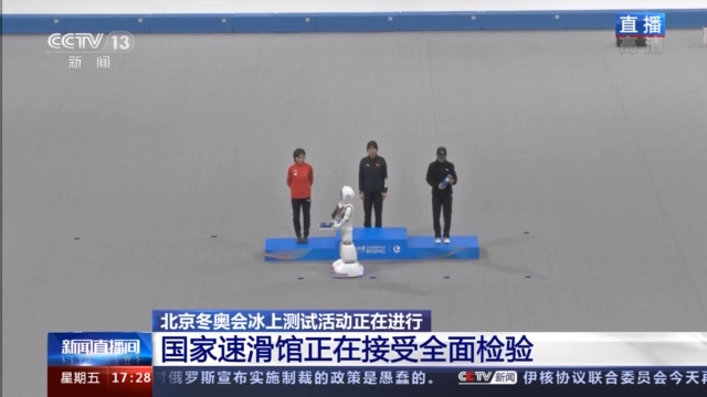 總臺記者 何暢:我現(xiàn)在正是在國家速滑館的比賽場地,現(xiàn)場目前正在進行的頒獎測試活動非常有意思,我們可以看到頒獎嘉賓正在給運動員頒獎,它可不是一般人,它是一臺智能機器人,別看這個智能機器人走起路來的樣子萌萌噠,實際上能力還不小,一方面它可以給運動員進行這種無接觸的頒獎;另外一方面,它可以識別運動員的身份,通過不同的語言去給運動員進行祝賀,比如像中文的“恭喜你,你滑得真是太棒了”,包括英文的“congratulations”等等。目前這臺機器人還在測試當(dāng)中,我們相信未來它將會具備更加嫻熟的頒獎動作,同時也能儲備更多的語言。