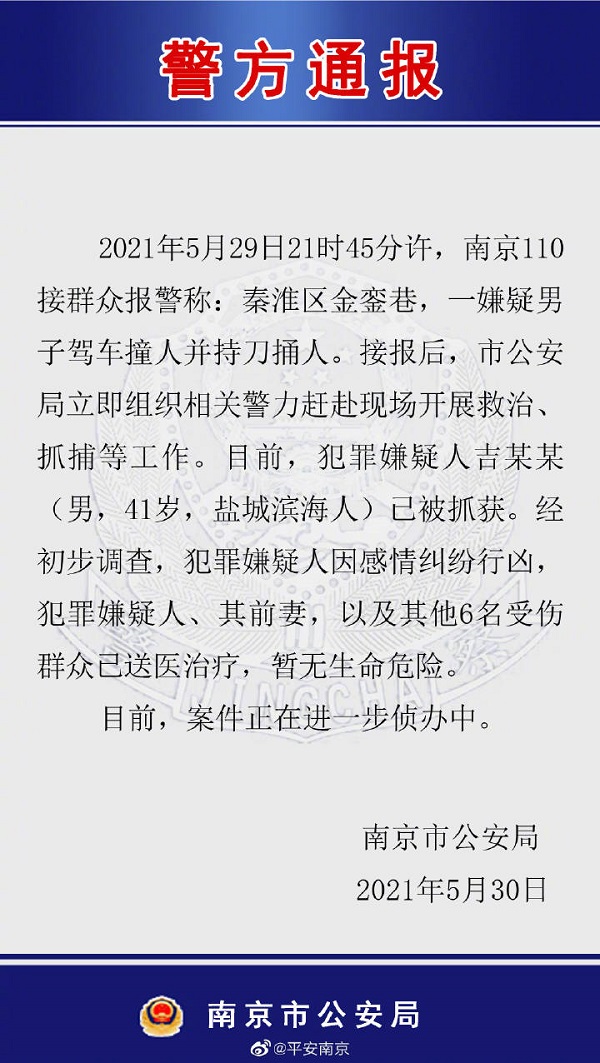 據(jù)南京市公安局官方微博消息,2021年5月29日21時(shí)45分許,南京110接群眾報(bào)警稱(chēng):秦淮區(qū)金鑾巷,一嫌疑男子駕車(chē)撞人并持刀捅人。接報(bào)后,南京市公安局立即組織相關(guān)警力趕赴現(xiàn)場(chǎng)開(kāi)展救治、抓捕等工作。目前,犯罪嫌疑人吉某某(男,41歲,鹽城濱海人)已被抓獲。經(jīng)初步調(diào)查,犯罪嫌疑人因感情糾紛行兇,犯罪嫌疑人、其前妻,以及其他6名受傷群眾已送醫(yī)治療,暫無(wú)生命危險(xiǎn)。