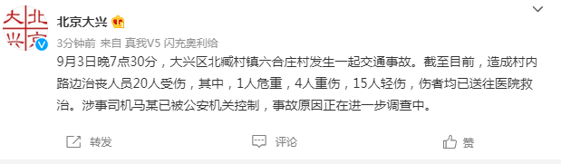 據(jù)“北京大興”微博消息,9月3日晚7點30分,大興區(qū)北臧村鎮(zhèn)六合莊村發(fā)生一起交通事故。截至目前,造成村內路邊治喪人員20人受傷,其中,1人危重,4人重傷,15人輕傷,傷者均已送往醫(yī)院救治。涉事司機馬某已被公安機關控制,事故原因正在進一步調查中。