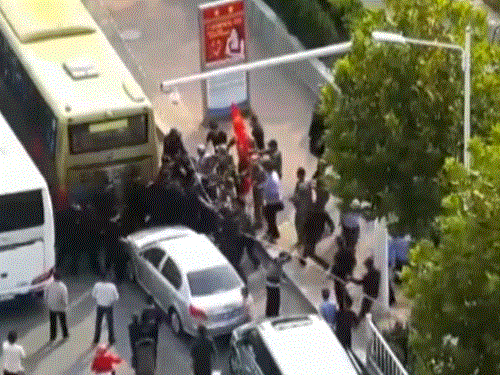 由于受干粉噴射,車內執(zhí)勤民警和被帶離人員呼吸困難,被迫從車輛天窗口爬至車頂,現(xiàn)場聚集人員仍不甘心,繼續(xù)用滅火器噴射車頂上的民警并投擲石塊。