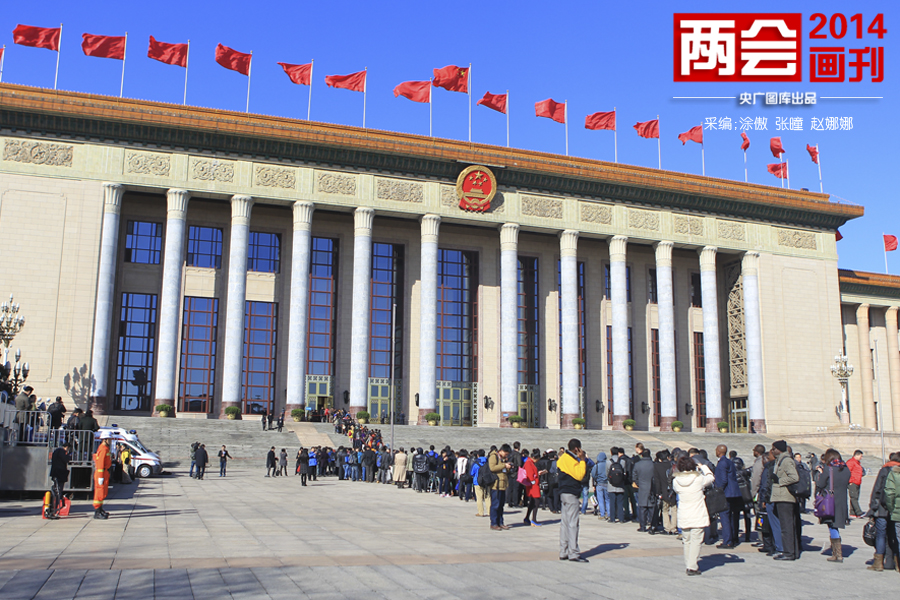 2014年3月4日,十二屆全國(guó)人大二次會(huì)議在人民大會(huì)堂舉行新聞發(fā)布會(huì)。圖為新聞發(fā)布會(huì)召開(kāi)前記者排隊(duì)進(jìn)場(chǎng)(央廣網(wǎng)記者 張曈 攝)