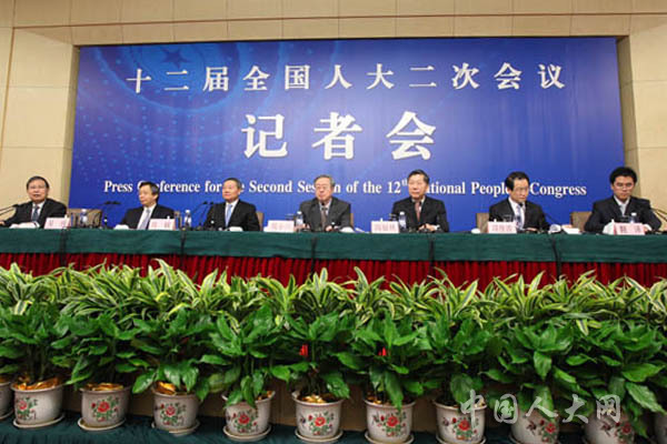 3月11日上午,十二屆全國(guó)人大二次會(huì)議在梅地亞中心舉行記者會(huì),中國(guó)人民銀行行長(zhǎng)周小川等五位嘉賓就“金融改革與發(fā)展”的相關(guān)問(wèn)題回答中外記者的提問(wèn)。圖為主席臺(tái)全景。羅榮 攝
