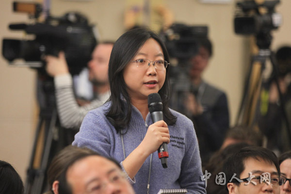 3月11日上午,十二屆全國人大二次會(huì)議在梅地亞中心舉行記者會(huì),中國人民銀行行長周小川等五位嘉賓就“金融改革與發(fā)展”的相關(guān)問題回答中外記者的提問。圖為中國日?qǐng)?bào)、中國日?qǐng)?bào)網(wǎng)記者提問。羅榮 攝
