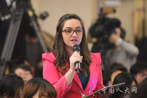 3月11日上午,十二屆全國(guó)人大二次會(huì)議在梅地亞中心舉行記者會(huì),中國(guó)人民銀行行長(zhǎng)周小川等五位嘉賓就“金融改革與發(fā)展”的相關(guān)問(wèn)題回答中外記者的提問(wèn)。圖為澳大利亞環(huán)球凱歌傳媒集團(tuán)記者提問(wèn)。羅榮 攝