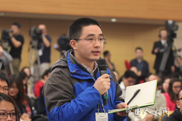 3月11日上午,十二屆全國人大二次會議在梅地亞中心舉行記者會,中國人民銀行行長周小川等五位嘉賓就“金融改革與發(fā)展”的相關(guān)問題回答中外記者的提問。圖為中國互聯(lián)網(wǎng)中心、中國網(wǎng)記者提問。羅榮 攝
