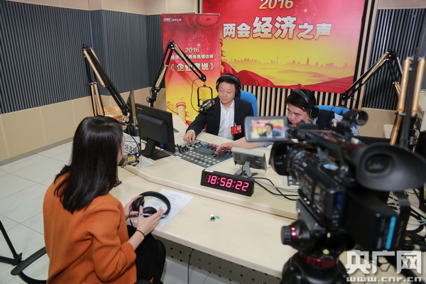 3月14日,中央人民廣播電臺經(jīng)濟(jì)之聲2016兩會高端訪談《企業(yè)家說》專訪全國人大代表、科大訊飛董事長劉慶峰(央廣網(wǎng) 李聰格 攝)