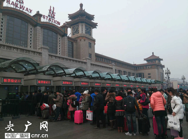 北京站回鄉(xiāng)旅客排隊(duì)檢票進(jìn)站 路況有點(diǎn)兒堵