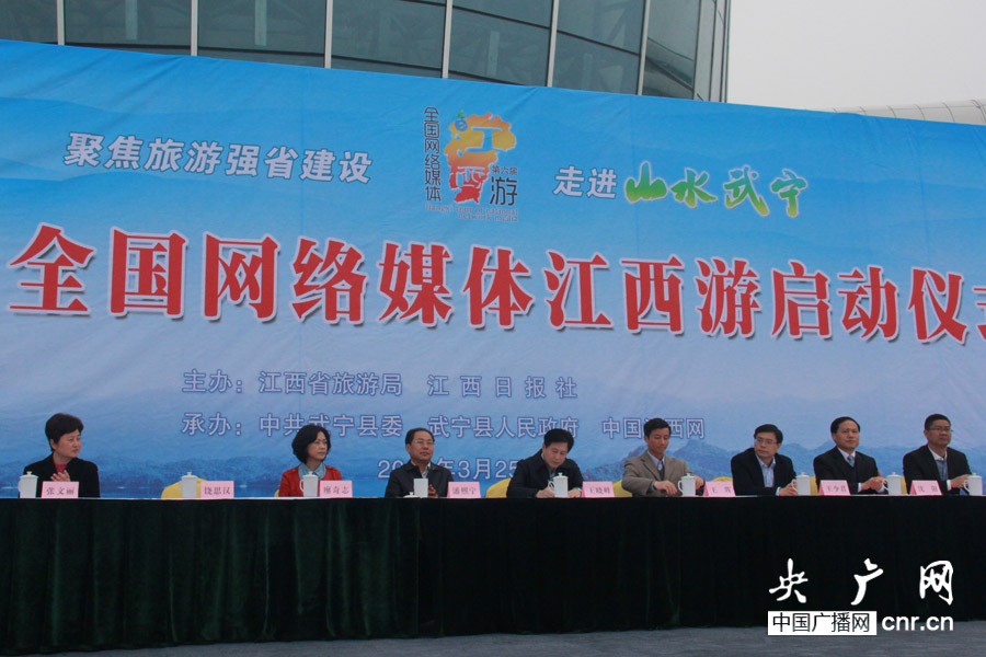 央廣網(wǎng)3月25日消息(記者劉千里)3月25日上午,“聚焦旅游強(qiáng)省建設(shè)——山水武寧·第六屆全國(guó)網(wǎng)絡(luò)媒體江西游”大型采風(fēng)活動(dòng)在江西九江武寧縣啟動(dòng)。江西省旅游局局長(zhǎng)王曉峰,江西日?qǐng)?bào)社社長(zhǎng)王暉出席啟動(dòng)儀式并講話。九江市委常委、市委宣傳部部長(zhǎng)潘熙寧宣布第六屆全國(guó)網(wǎng)絡(luò)媒體江西游正式啟動(dòng),并向媒體代表授旗。九江市副市長(zhǎng)廖奇志在啟動(dòng)儀式上講話。武寧縣委書(shū)記沈陽(yáng)致歡迎辭。