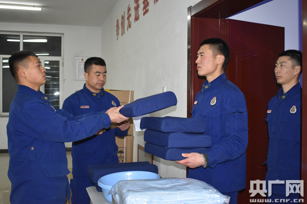 新訓(xùn)骨干為新消防員領(lǐng)取被裝。