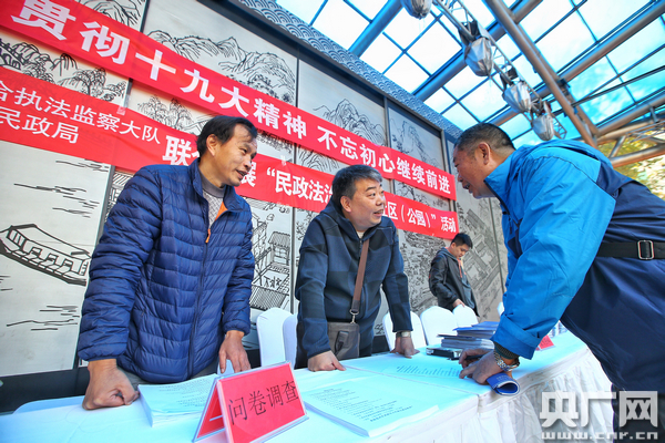 上午9時(shí)30分,海淀區(qū)煙樹(shù)園社區(qū)廣場(chǎng)道路兩側(cè)豎起了30余塊宣傳展板,有學(xué)習(xí)貫徹十九大精神展板,有民政法律宣傳展板,有民政執(zhí)法典型案例展板等。豐富的展板內(nèi)容吸引了社區(qū)大量居民前來(lái)圍觀學(xué)習(xí);顒(dòng)還通過(guò)問(wèn)卷調(diào)查、發(fā)放宣傳品等方式,向居民傳達(dá)十九大精神、展示首都民政執(zhí)法建設(shè)情況、介紹民政執(zhí)法相關(guān)法律法規(guī)、解讀民政執(zhí)法典型案例、宣傳民政違法信息舉報(bào)方式。