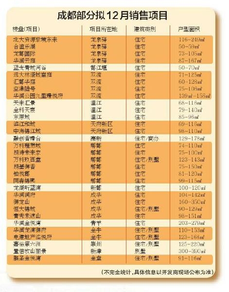 記者梳理龍泉驛、雙流、溫江、郫都、成華、青羊、金牛及都江堰、天府新區(qū)等地樓盤公開信息發(fā)現(xiàn),包括華潤、萬科、恒大、融創(chuàng)、龍湖、置信、藍(lán)光、朗詩、嘉裕、東原、金科、中海等品牌開發(fā)商在內(nèi),12月份預(yù)計(jì)有32個(gè)項(xiàng)目、8000多套房源待售,其中別墅物業(yè)項(xiàng)目有7個(gè),住宅物業(yè)25個(gè),產(chǎn)品面積從最小戶型套二到大面積套四套五戶型皆有,剛需及改善購房者的選擇性范圍都比較大。某開發(fā)商營銷負(fù)責(zé)人告訴記者,目前公司正在等待相關(guān)部門落實(shí)具體的搖號(hào)選房操作辦法,一旦獲得預(yù)售證就將開盤。