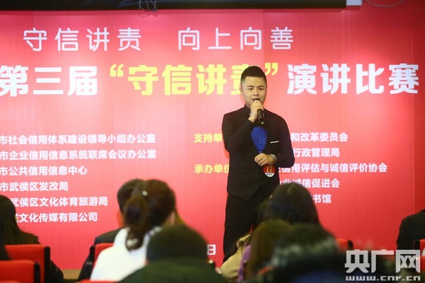 央廣網(wǎng)成都12月27日消息(記者韓民權(quán))為貫徹落實“十九大”精神,踐行社會主義核心價值觀,積極推動成都市社會信用體系建設(shè)。12月27日,成都市第三屆“守信講責(zé)”演講比賽在成都武侯區(qū)圖書館舉行。30余位選手圍繞“守信講責(zé) 向上向善”的主題上演了精彩演講。