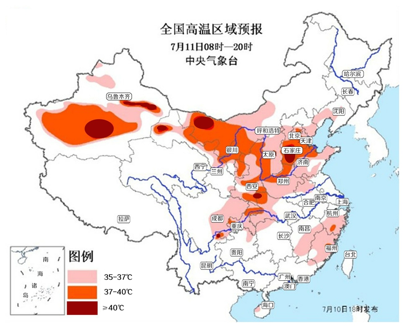 中央氣象臺(tái)7月10日18時(shí)繼續(xù)發(fā)布高溫黃色預(yù)警:預(yù)計(jì),7月11日白天,華北中南部、黃淮、西北地區(qū)東部、內(nèi)蒙古西部、甘肅中西部、新疆南疆盆地、四川盆地、湖北西部以及浙江中南部、福建、江西東部等地有35℃以上的高溫天氣,其中,河北中南部、河南北部、山東北部、內(nèi)蒙古西部、甘肅西部、寧夏、山西西南部、陜西關(guān)中地區(qū)和南部、浙江南部、福建東部以及新疆南疆盆地等地的部分地區(qū)最高氣溫可達(dá)37-39℃,局地可超過40℃。(記者吳冰清)