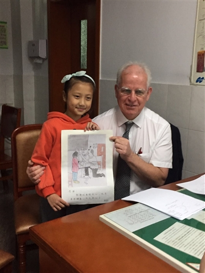 2016年秋天,英國牛津大學(xué)教授Peter單膝跪地為德陽女孩星星(化名)檢查眼睛,星星媽媽瞬間感動(dòng)并拍下這一幕。今年秋天,Peter教授再次來到德陽義診,星星按照媽媽拍下的照片畫了一幅畫送給Peter。教授很喜歡這幅畫,再三叮囑助手不要將畫弄皺了。10月24日,Peter帶著這幅畫離開德陽,他說要把這幅畫帶回英國裱起來,明年?duì)幦≡賮淼玛枴?/p>