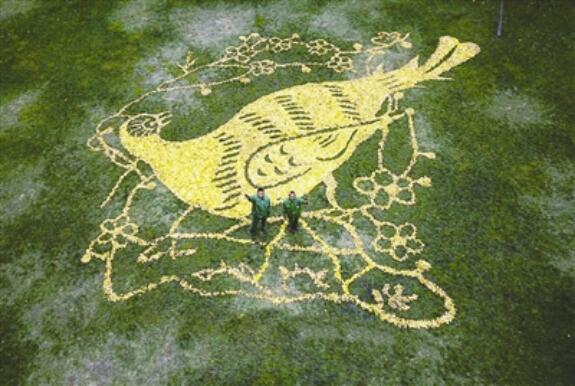 3日上午,郫都區(qū)置信逸都小區(qū)內(nèi),老何和搭檔花了近4個小時在小區(qū)中庭的大草地上“畫”出了一幅銀杏新作——臘梅花開枝頭,畫眉回眸而棲。“還要再改改,看上去全是線條!崩虾螌@幅銀杏圖不是很滿意。吃過午飯,他讓搭檔老王再去拉些銀杏葉來,“把畫眉用葉子填滿,把線條用草地本身體現(xiàn),讓它更渾然一體,更有沖擊力!
