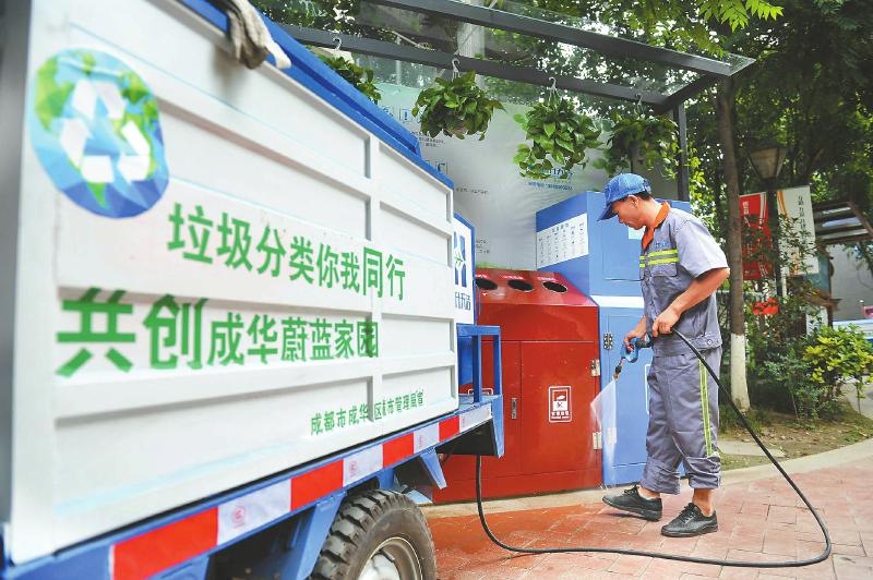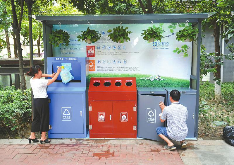 8月1日,成都市成華區(qū)府青路街道一居民小區(qū),居民正在往專設(shè)的分類垃圾箱內(nèi)扔垃圾。