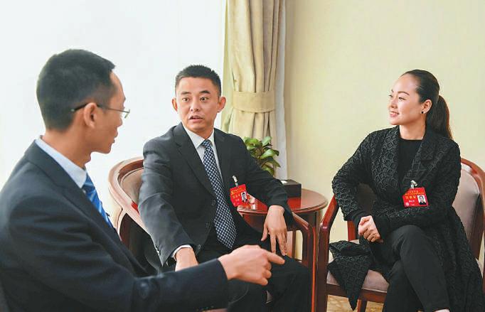 李月志代表(中)和楊峰代表(左)、陳正平代表(右)在駐地?zé)崃摹?/p>