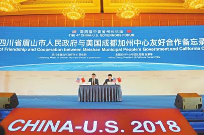 相聚 第四屆中美省州長(zhǎng)論壇上,兩國(guó)各地嘉賓相聚成都。本版圖片由 本報(bào)記者 郝飛 攝 相約 眉山市政府與美國(guó)加州中心簽署友好合作備忘錄,相約共建眉山加州智慧小鎮(zhèn)。相談 中美企業(yè)代表洽談合作。