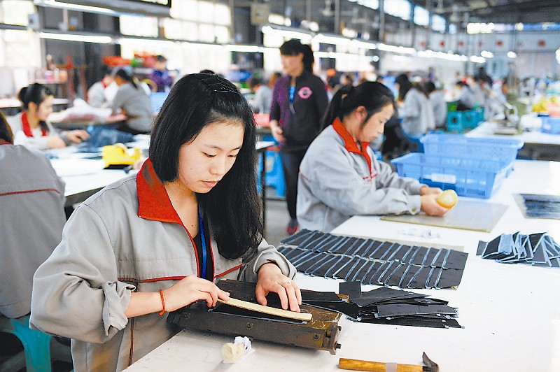 富順縣紅谷實(shí)業(yè)有限責(zé)任公司的員工在生產(chǎn)車間制作皮包。該企業(yè)是典型的勞動密集型企業(yè)。 本報記者 李向雨 攝(資料圖片)