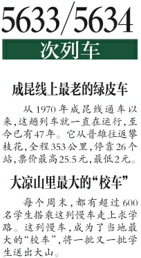 這趟火車,車次為5633/5634次,是成昆線上四川境內(nèi)最后的兩列慢車之一,從1970年成昆線通車以來就一直在運行,至今已有47年。它從普雄往返攀枝花,全程353公里,?26個站,票價最高25.5元,最低2元。