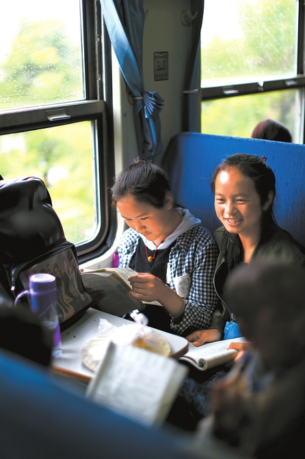 5月14日,在慢火車上看書的學(xué)生。