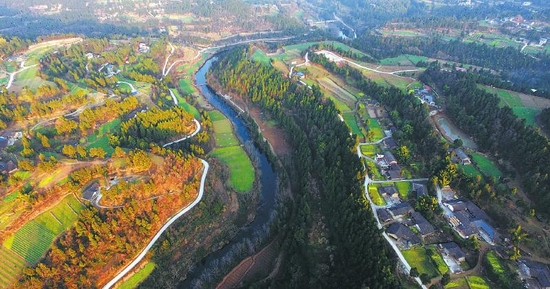 1月14日記者在閬中市棗碧鄉(xiāng)楊家河村上空俯拍的楊家河沿線風(fēng)光。近年來(lái),當(dāng)?shù)卮罅Πl(fā)展鄉(xiāng)村旅游和香桃種植產(chǎn)業(yè),在楊家河村陸續(xù)投放10艘竹筏,設(shè)立專門農(nóng)產(chǎn)品交易區(qū),打造稻田捉魚、農(nóng)田拉水、皮劃艇漂流等旅游體驗(yàn)項(xiàng)目。目前該村新開辦農(nóng)家樂8家,旺季日均接待游客達(dá)到1500人次。本報(bào)記者李向雨攝