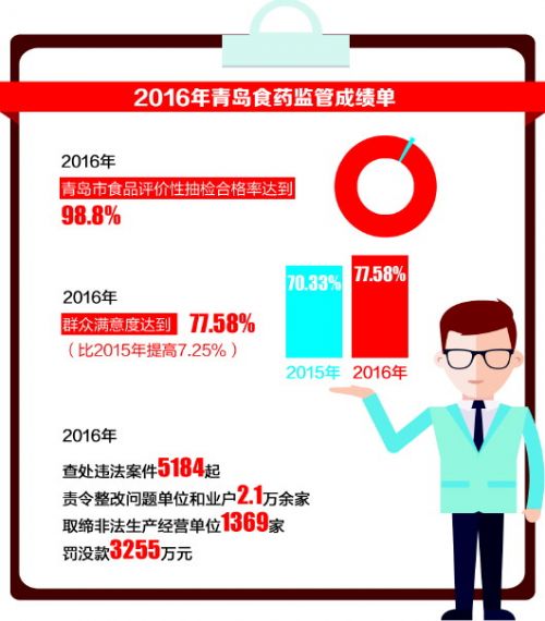 2月7日,記者從2017年創(chuàng)建國家食品安全示范城市推進會暨食品藥品監(jiān)督管理工作會上獲悉,去年,青島市食品評價性抽檢合格率達到98.8%,社情民意調(diào)查群眾滿意度達77.58%,處于歷史最高水平。去年,各級各部門共查處違法案件5184起,責(zé)令整改問題單位和業(yè)戶2.1萬余家。今年,本市將繼續(xù)加大食藥工作的監(jiān)管力度,市食藥監(jiān)局列出今年重拳整治的三個方向。