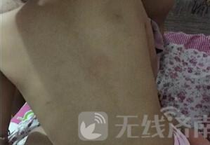 從這個女士昨晚拍攝的照片可以看出,四歲的小女孩陽陽的兩側(cè)肩膀、以及后背有多處青紅?吹胶⒆由砩系膫,鄭女士和丈夫今天一早便來幼兒園查看了監(jiān)控。