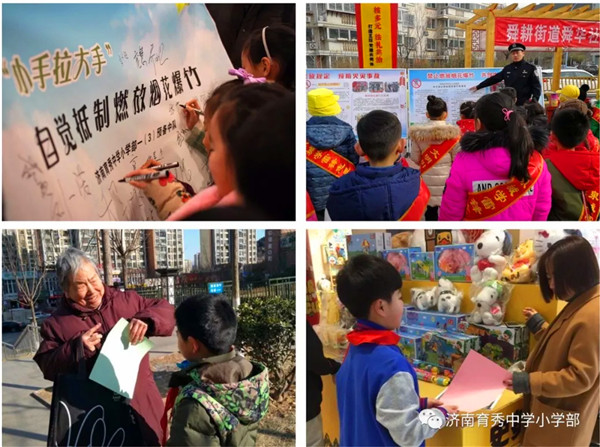 鑄安全 師生們假期開(kāi)展了“禁止燃放煙花爆竹”的各類(lèi)倡議活動(dòng),發(fā)傳單、條幅簽名、安全宣講。社區(qū)的叔叔阿姨、爺爺奶奶連連為他們豎起大拇指!