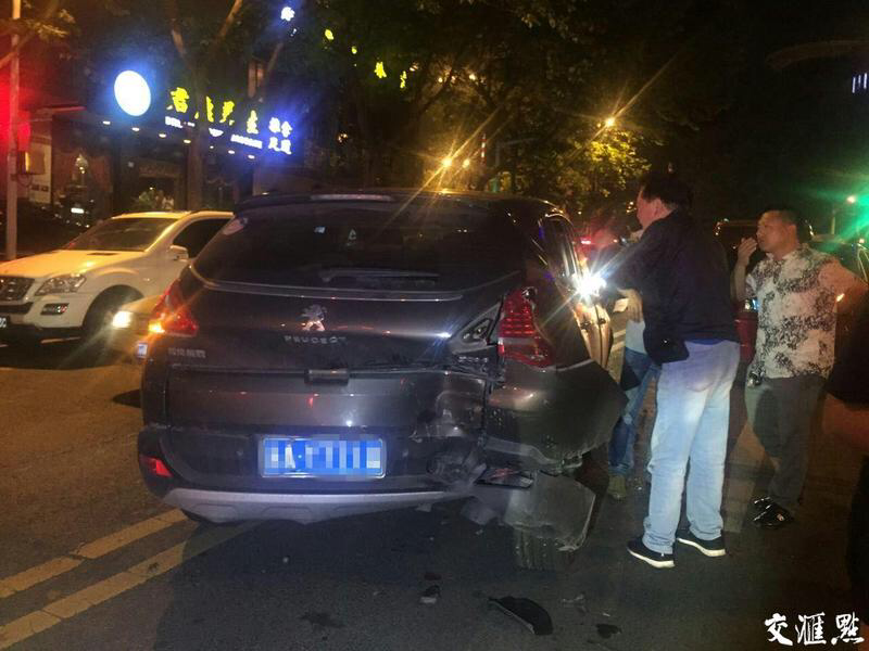 被追尾的前三輛車都不同程度受損。尤其第一輛標致轎車里三名乘客頭部不適被120送醫(yī)院治療。賓利車頭受損漏水漏油。