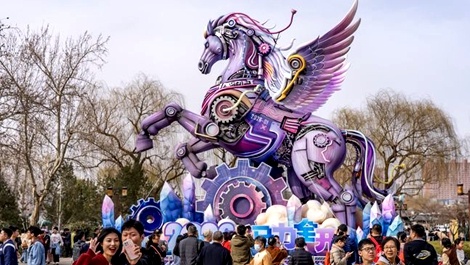 春節(jié)假期,濟(jì)南市第45屆天下第一泉迎春花燈會“馬力全開”燈組在大明湖南岸正誼廣場持續(xù)“圈粉”。