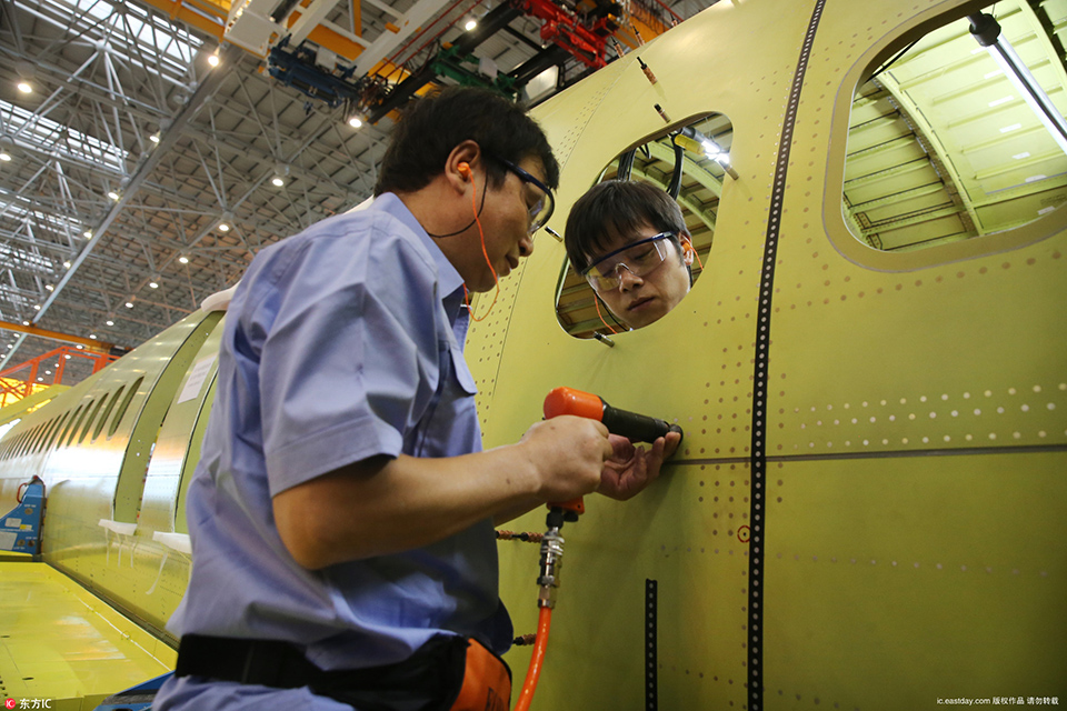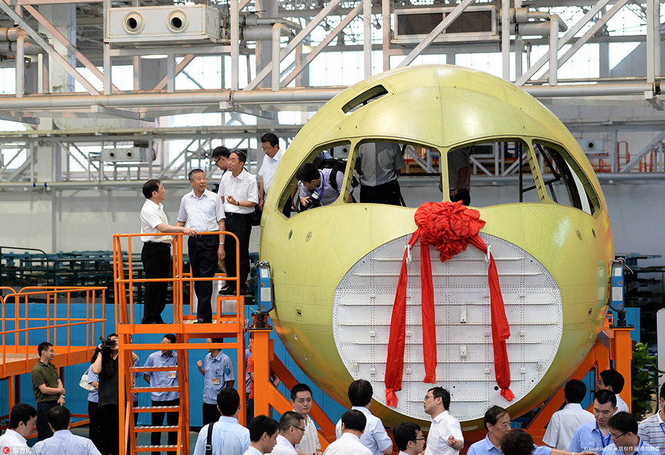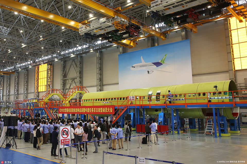 2014年9月19日,上海,中國(guó)商飛公司研制的C919國(guó)產(chǎn)大型客機(jī)前機(jī)身與中機(jī)身的對(duì)合標(biāo)志著C919拉開(kāi)了總裝序幕。