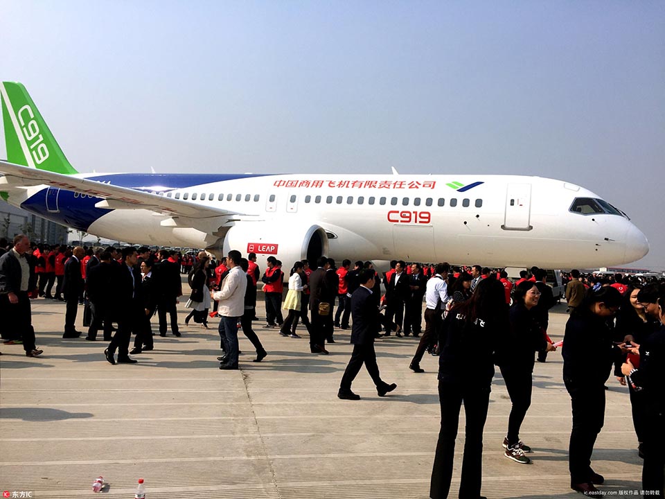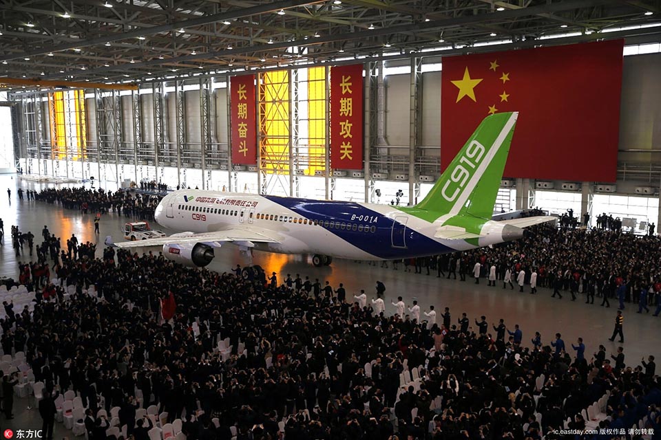 2015年11月2日上午,在中國(guó)商飛公司新建成的總裝制造中心浦東基地廠房?jī)?nèi),隨著兩扇帷幕緩緩拉開(kāi),一架帶有“商飛藍(lán)”和“商飛綠”涂裝的新型商用飛機(jī)完整地展現(xiàn)在世人面前,這正是我國(guó)自主研制的C919大型客機(jī)。圖為下線儀式現(xiàn)場(chǎng)。