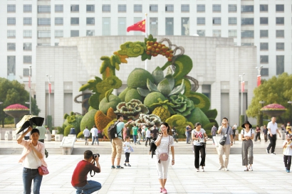 12米高的立體花壇“秋實滿園”亮相人民廣場,吸引市民游客駐足欣賞。記者 蔣迪雯 攝
