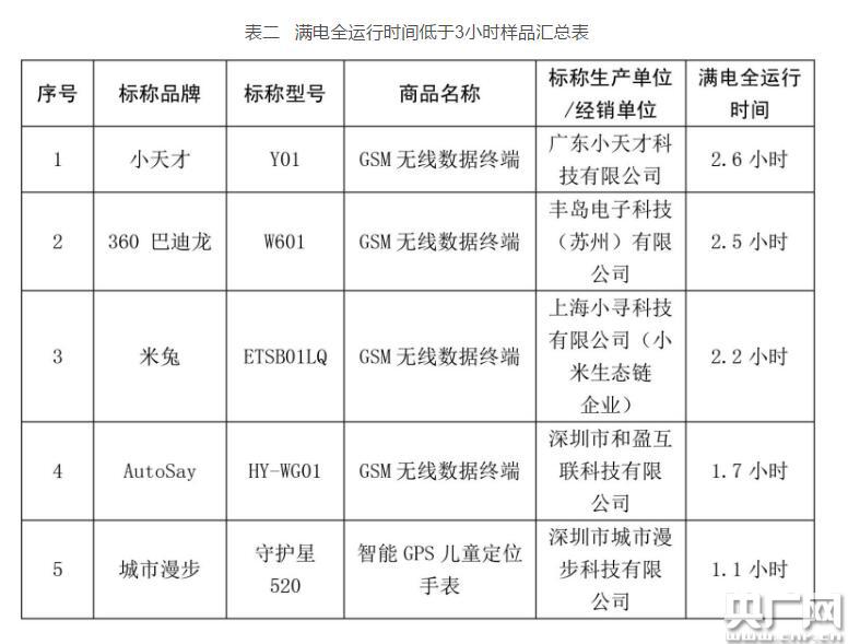 測試結(jié)果顯示,20塊樣品的滿電全運(yùn)行時間均不超過10小時,最長的為9.2小時,最短的為1.1小時。其中僅2塊樣品達(dá)到8小時以上,5塊樣品低于3小時且都為兒童智能手表(詳見表二)。
