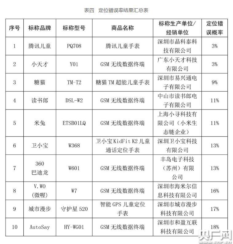 此外,由于目前兒童智能手表的重要用途之一是定位,本次試驗測試了10塊兒童智能手表的定位準(zhǔn)確性。結(jié)果顯示,兒童智能手表在地下或嘈雜環(huán)境中定位易出錯。在10塊兒童智能手表樣品中,僅有“騰訊兒童”和“小天才”的定位錯誤概率小于5%,另外8塊的定位錯誤概率超過5%(詳見表四)。兒童智能手表定位易出錯的地點主要集中在地下停車場、地鐵站、環(huán)境嘈雜的商場等區(qū)域,而在學(xué)校、醫(yī)院等區(qū)域定位準(zhǔn)確性比較理想。