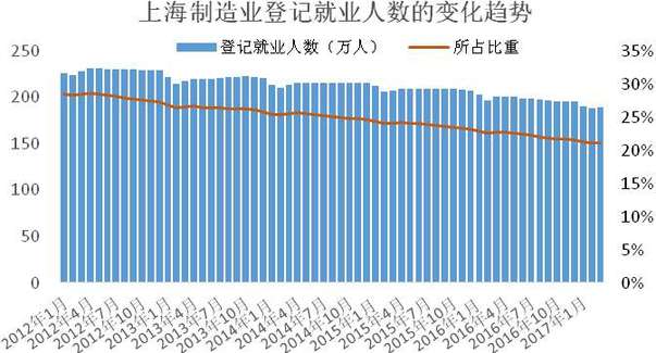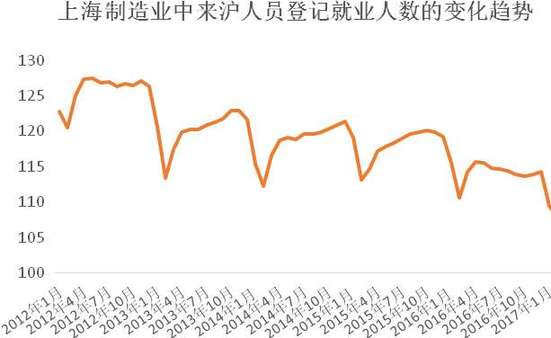 據(jù)介紹,2017年3月,上海制造業(yè)登記就業(yè)人數(shù)為189.8萬人,同比減少5.3%。其中,外省市來滬人員共110.3萬人,與五年前同期水平相比累計減少14.8萬人,下降幅度為11.8%。從近年來的變化趨勢看,上海制造業(yè)登記就業(yè)人數(shù)總體呈現(xiàn)震蕩下行的趨勢。制造業(yè)登記就業(yè)人數(shù)占上海登記就業(yè)總?cè)藬?shù)的比重,也從2012年3月的28.4%,下降到2017年3月的21.2%。
