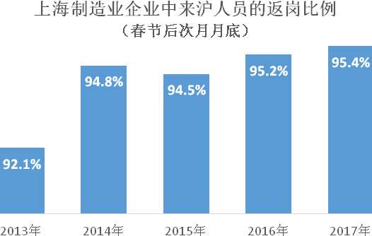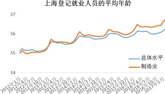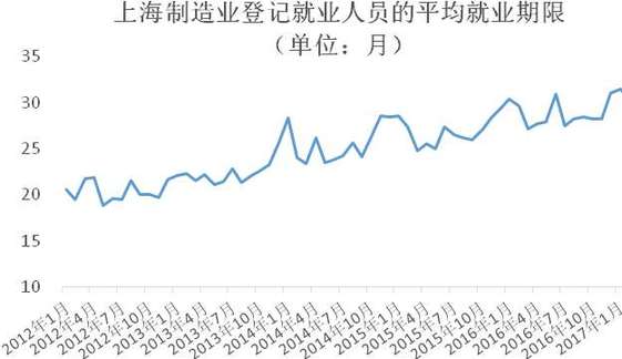 統(tǒng)計數(shù)據(jù)顯示,上海制造業(yè)登記就業(yè)人員的平均就業(yè)期限為30.4個月,與2012年同期相比上升8.6個月;平均年齡為36.7歲,比2012年同期高1.7歲,其中高學(xué)歷勞動者越來越多。2017年3月,上海制造業(yè)登記就業(yè)人員中,大專以上學(xué)歷的約占23.0%,同比上升1.2個百分點,與五年前同期水平相比上升5.8個百分點。